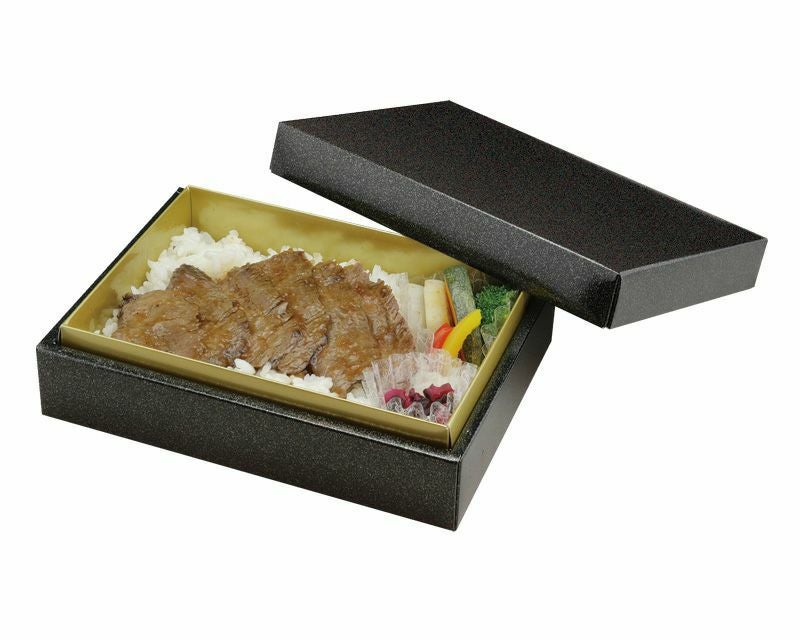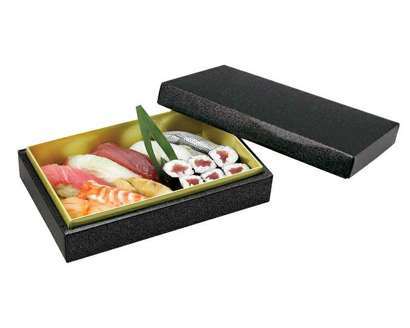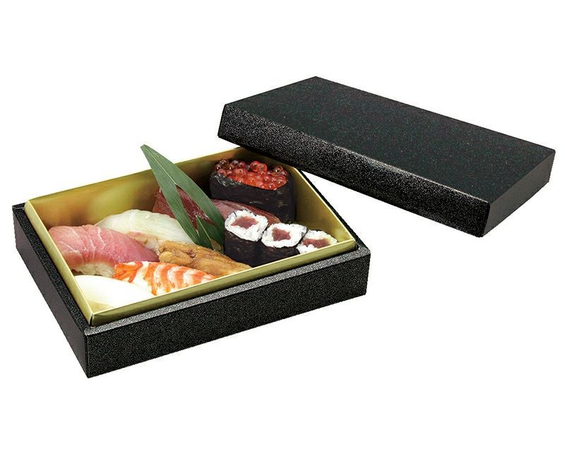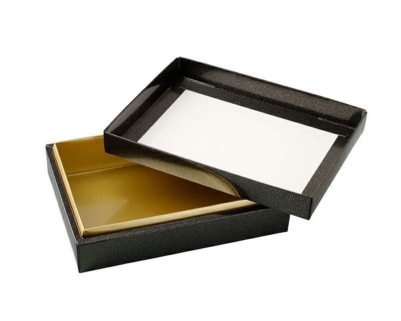 漆器のような質感で、高級感のある紙製のお重箱。 内箱は素材と構造により、水分がこぼれることがありません。