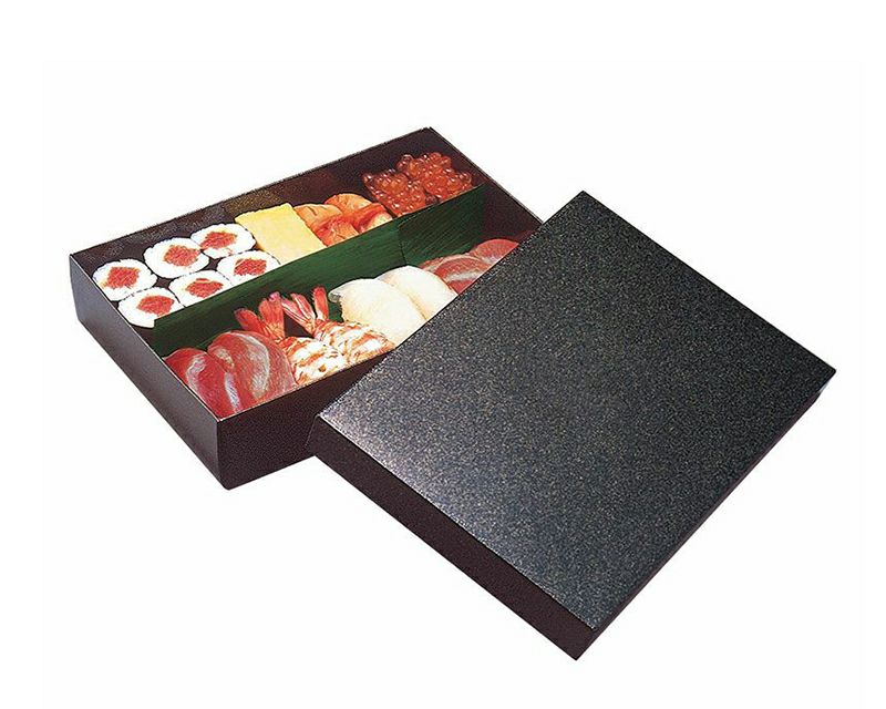 漆器のような質感で、高級感のある紙製の寿司折。江戸前の折箱より幅が広く出来ています。 また、深さが42mmあるので軍艦巻きなどがフタの裏面に付きづらくなっています。 ワンタッチでとても簡単に組み立てることができます。