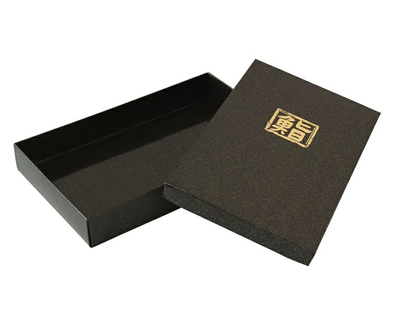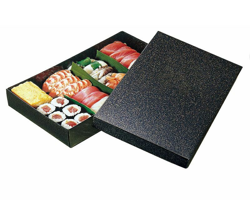 漆器のような質感で、高級感のある紙製の寿司折。 江戸前の折箱の寸法で、7寸折から尺折までご用意しています。 ワンタッチでとても簡単に組み立てることができます。